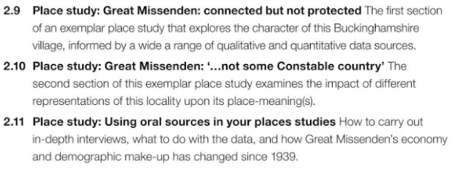 1. Read through (thoroughly) the Great Missenden Case study from pp 96 to 105. Pay particular attention to the range of different types of data employed in the case study.
